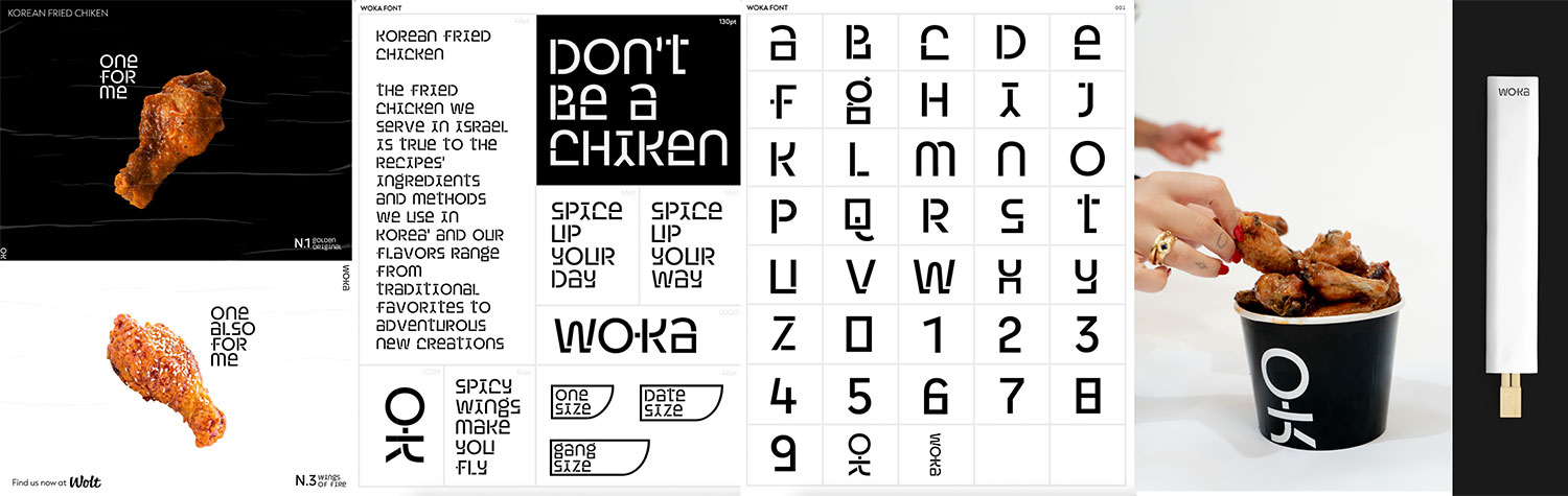 WOKA – מיתוג למסעדת עוף קוריאני מטוגן שנוצר בקורס מיתוג מתקדם בהנחיית יעל בודשר – נשען על המפגש בין חדשנות למסורת, מזרח–מערב ואוכל רחוב–ביתי. נועה פיתחה את WOKA Font, פונט לטיני בהשראת האותיות הקוריאניות, כדי לבטא שפה גלובלית עם שורשים מקומיים. השפה הצילומית והקופי הקליל מייצרים מותג צעיר, שובב ואורבני – עם עומק תרבותי שמחבר בין סיאול לתל־אביב.